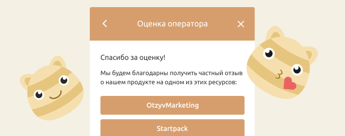 Собирайте больше отзывов от своих клиентов, увеличивайте количество упоминаний компании в интернете и поднимайтесь в рейтингах. Можно показывать всем или только при положительной оценке по итогам диалога.