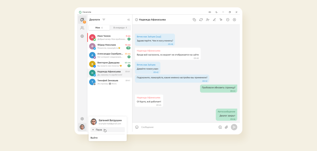 Разделили чаты в работе и нераспределенные: во вкладке "Мои" находятся чаты, которые принял оператор, а "В очереди" - клиенты, к которым еще не подключились сотрудники для консультации.
