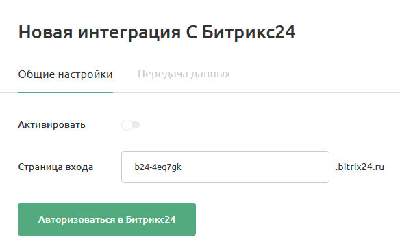 3Для активации интеграции сначала необходимо провести авторизацию в подразделе «Общие настройки». Введите домен Битрикс24 (который Вы указывали при регистрации на сайте Битрикс24, либо сможете увидеть домен в адресной строке браузера, если находитесь в личном кабинете Битрикс24). Далее нажмите на «Авторизоваться в Битрикс24».