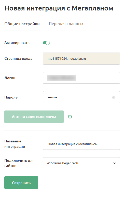 3Если все данные были введены корректно, авторизация будет выполнена, и появится возможность активировать интеграцию. Для этого включите флажок напротив «Активировать» и нажмите на кнопку «Сохранить».