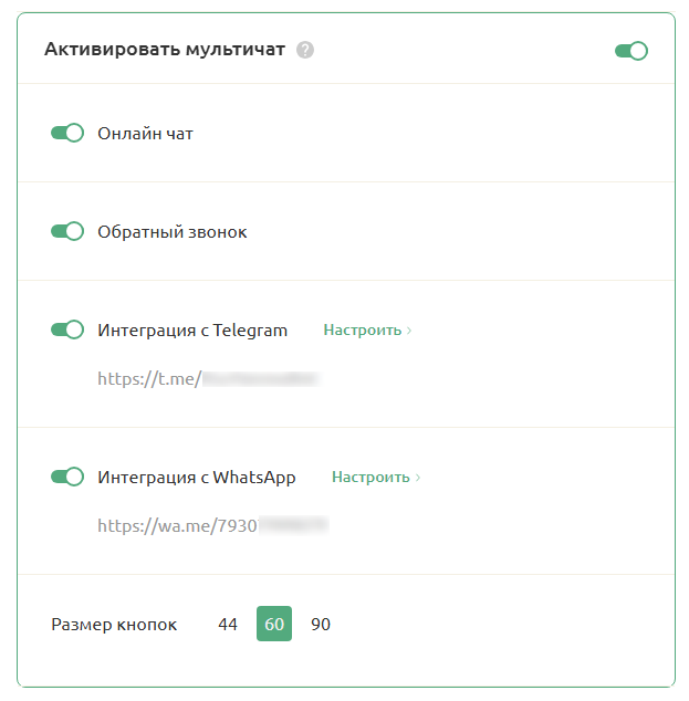 Для отображения кнопки WhatsApp на вашем сайте перейдите в раздел Дизайн → пролистайте вниз и активируйте мультичат → передвиньте свитч «Интеграция с WhatsApp» в активное положение.