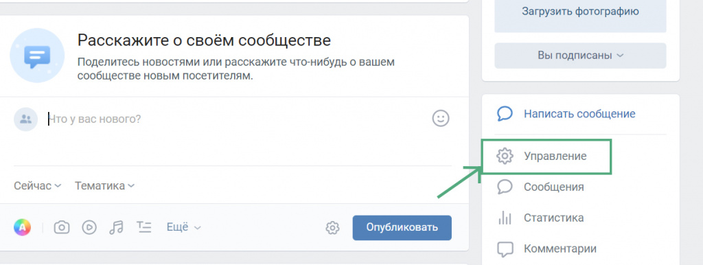 - Для более стабильной работы вашей будущей интеграции удалите старую интеграцию еще со стороны «ВКонтакте». Для этого зайдите на главную страницу своего сообщества и в меню справа выберите пункт «Управление»