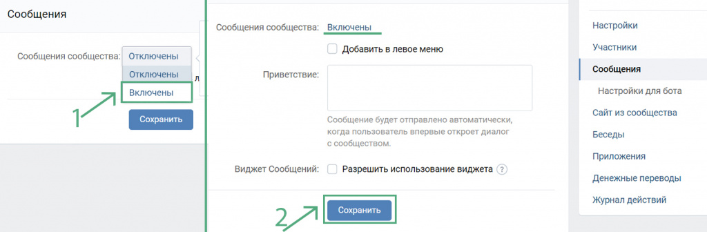 - По умолчанию сообщения сообществу отключены. Выберите в выпадающем списке пункт «Включены» (1). После этого должно отобразиться, что сообщения сообществу включены. Не забудьте сохранить изменения, нажав кнопку «Сохранить» (2).
