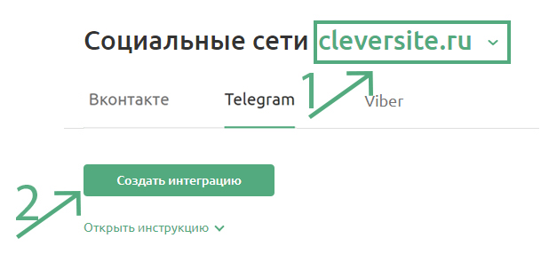 - 9На этой странице выберите из выпадающего списка (1) сайт, с которым вы создаете интеграцию Telegram и нажмите «Создать интеграцию» (2).