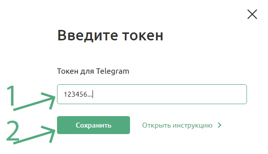 - 10Вставьте токен, скопированный на шаге 6, в появившееся поле для ввода токена (1) и нажмите «Сохранить» (2).