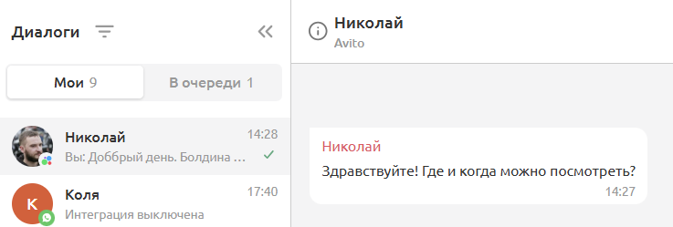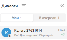 Если пользователь написал в чат, диалог отобразится в пульте в разделе «Диалоги» во вкладке «Мои» или «В очереди» (в зависимости от настроек распределения диалогов и статуса оператора).