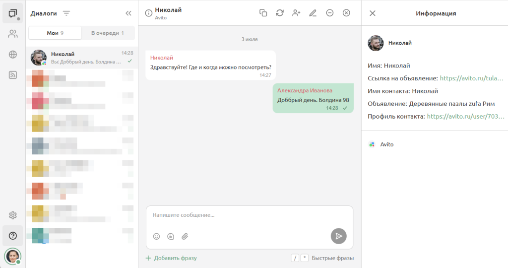 Из канала Авито отображается информация об имени контакта, аватар, ссылка на ваше объявление и профиль покупателя.