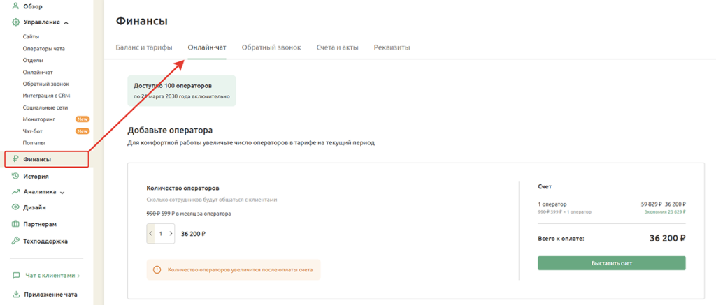 Для увеличения количества операторов необходимо зайти в Личный кабинет → Финансы → вкладка «Онлайн-чат».