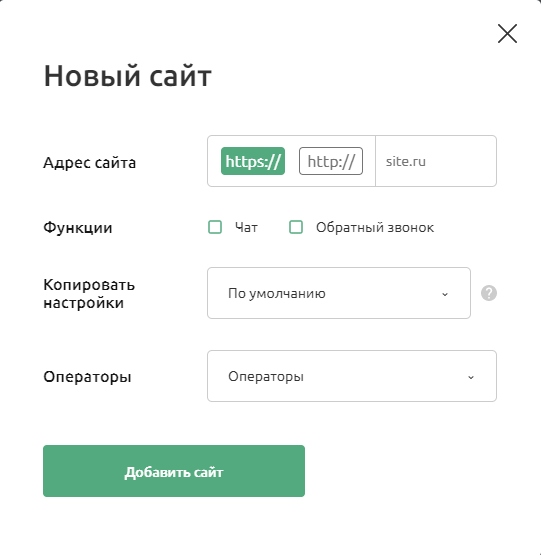 - 4 Выберите используемый протокол, в текстовом поле укажите адрес сайта. Выберите нужную функцию и добавьте операторов, если устанавливаете обратный звонок, необходимо будет добавить менеджера звонков в разделе "Управление" - "Обратный звонок".