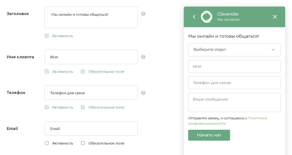 Полям можно настроить обязательность — без заполнения обязательных полей посетитель не сможет начать диалог.
